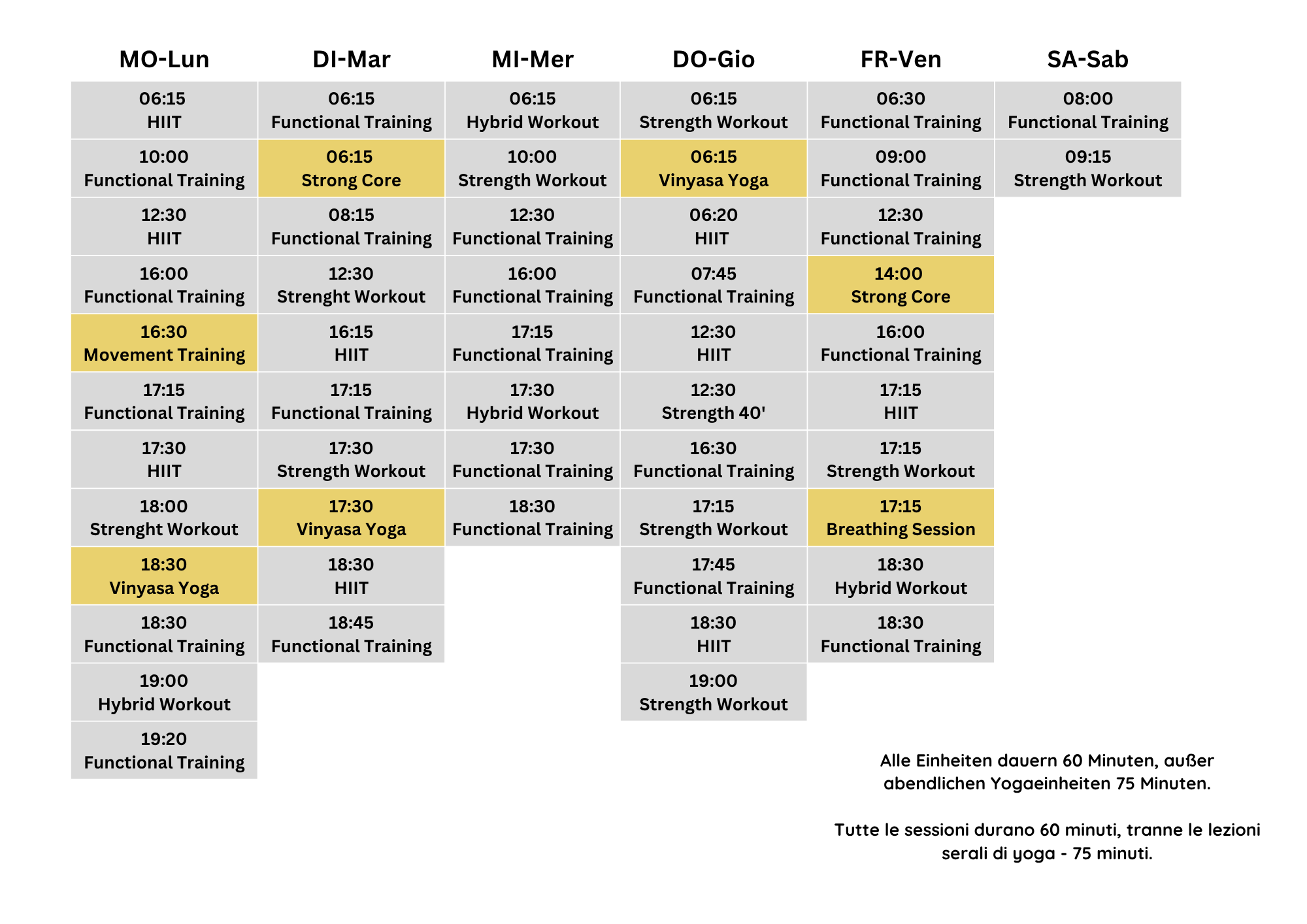 Mit deiner Mitgliedschaft hast du jetzt die Möglichkeit, an all unseren Gruppentrainings wie Strength & Conditioning, Strength Training, Movement und Challenge Workouts sowie an unseren Yoga- und Pilates-Kursen teilzunehmen. Nutze deine Einheiten flexibel nach deinen Bedürfnissen und variiere dein Training ganz nach Belieben. Ob du Abwechslung suchst oder dich regelmäßig für z.B. eine Yoga-Stunde einbuchst – die Entscheidung liegt ganz bei dir – maximale Flexibilität für deine persönlichen Vorlieben und deinen Fortschritt!